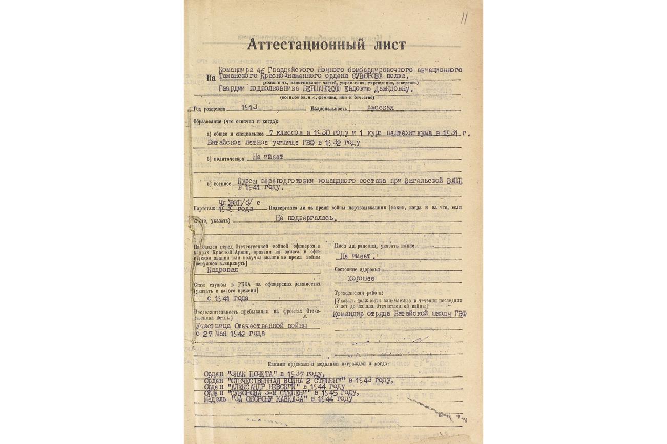 "Гвардии подполковник Бершанская командует полком со дня его формирования с 20 декабря 1941 г. Полк сформирован в основном из девушек-добровольцев, которые не служили в Красной Армии, и в условиях боевой жизни тов. Бершанская сумела сплотить дружный коллектив, который хорошо выполнял боевую работу в сложных условиях боевой деятельности в период Отечественной войны. Тов. Бершанская сама переучила 80% из младших специалистов. За время Отечественной войны под руководством тов. Бершанской полк произвел 23 672 боевых вылета с боевым налетом", — сообщается в аттестационном листе Бершанской от 22 июля 1945 года.