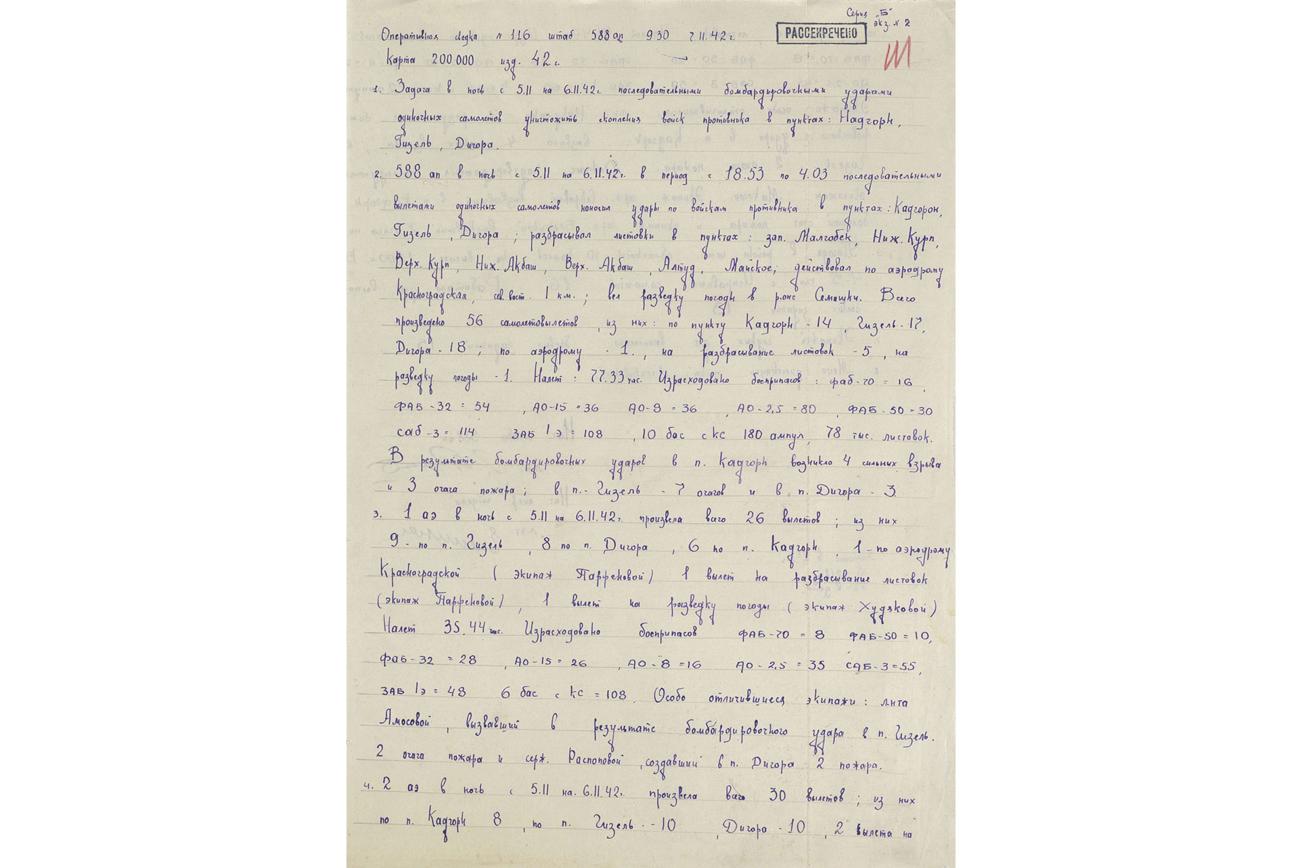 "588 ап (авиаполк — прим. ТАСС) в ночь с 5.11 на 6.11.[19]42 в период с 18.53 по 4.04 последовательными вылетами одиночных самолетов наносил удары по войскам противника в пунктах: Кадгорон, Гизель, Дигора <…>. Всего произведено 56 самолетовылетов", — сообщается в оперативной сводке №116 за 7 ноября 1942 года. В другой сводке за 23 апреля 1943 года указывается, что авиагруппа произвела 24 вылета, благодаря которым удалось создать очаг пожара в районе высоты 307,2. Также в боевом донесении за 2 августа 1943 года подчеркивается, что женское подразделение выполнило 15 вылетов, что привело к мощному взрыву в атакуемом населенном пункте.