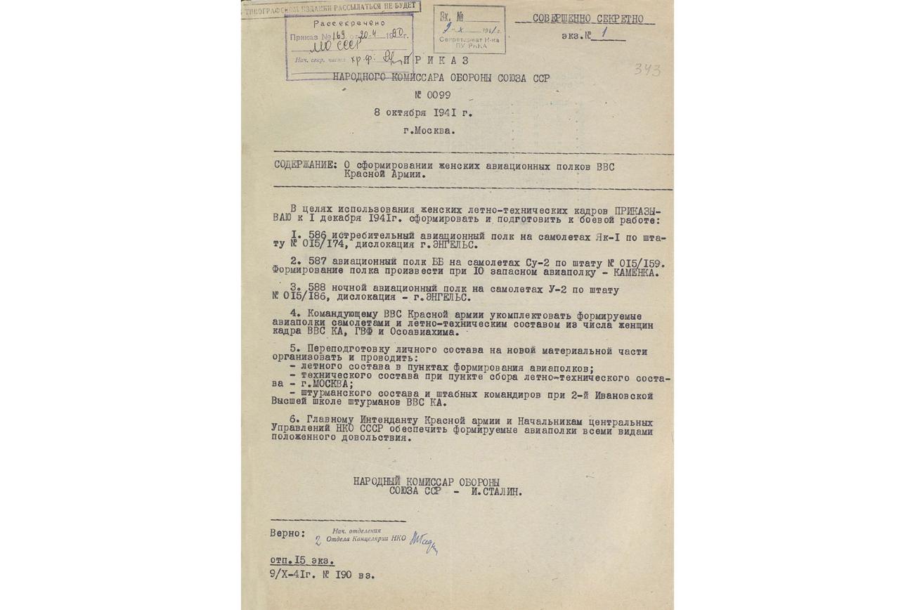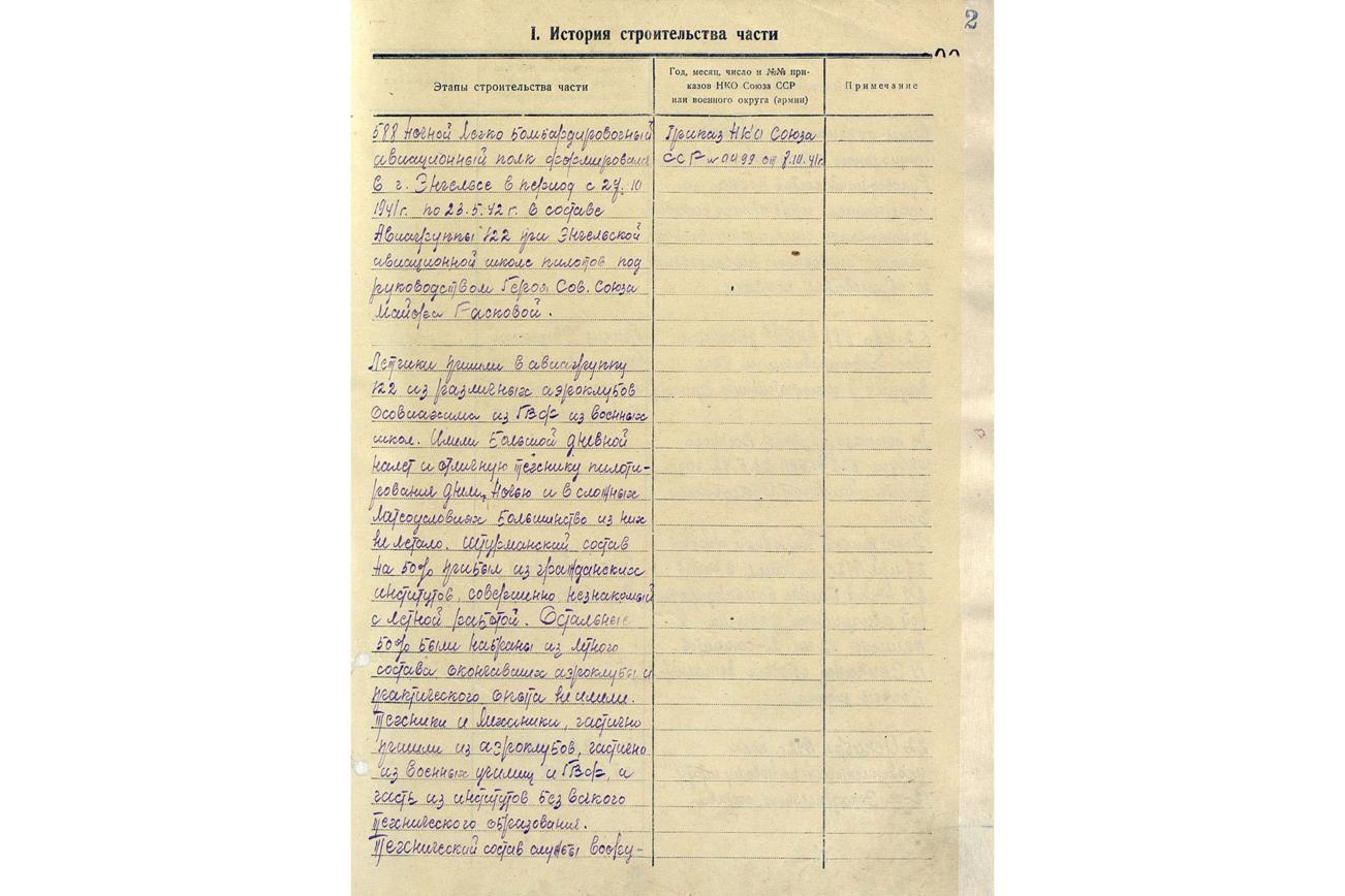 "05.02.1942 г. 588 НЛБАП (ночной легкобомбардировочный авиационный полк — прим. ТАСС) закончил свое формирование и был выделен в самостоятельную единицу", — сообщается в приказе Энгельсской авиационной школы пилотов №05 от 5 февраля 1942 года.