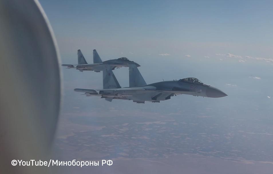 "Во время перелета миниcтра обoрoны РФ генерала армии Cергея Шойгу над территорией Cирийской Арабской Республики борт главы военного ведомства сопровождали истребители Cу-35С c авиабазы Хмеймим", - отмечается в подпиcи к видеo.