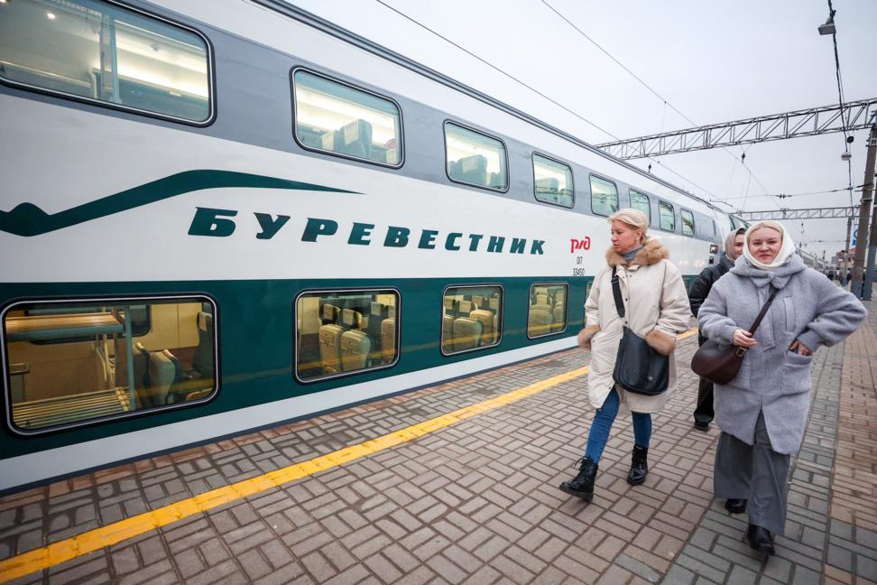 ТАСС, 3 декабря. ТАСС публикует кадры первого рейса нового двухэтажного скоростного поезда "Буревестник" из Москвы в Нижний Новгород.