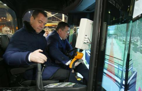 После этого премьер осмотрел образцы техники, которую выпускает "Трансмашхолдинг". Медведев прошел по салону нового трамвая "Витязь", заглянул в кабину, сел в кресло водителя, закрыл двери трамвая и проехал, управляя им, несколько метров.