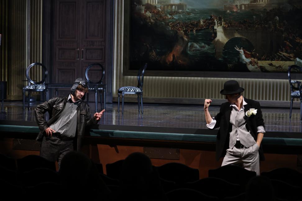 В Российском академическом молодежном театре (РАМТ) представили необычный спектакль: на сцене параллельно играют две пьесы — фарс в духе комедии дель арте и военную драму. Автор идеи и постановки — народный артист России, художественный руководитель РАМТа Алексей Бородин. Рассказываем, как режиссеру удалось привести совершенно разные по настроению произведения к общему знаменателю, чем удивила постановка и чего от нее ожидать.