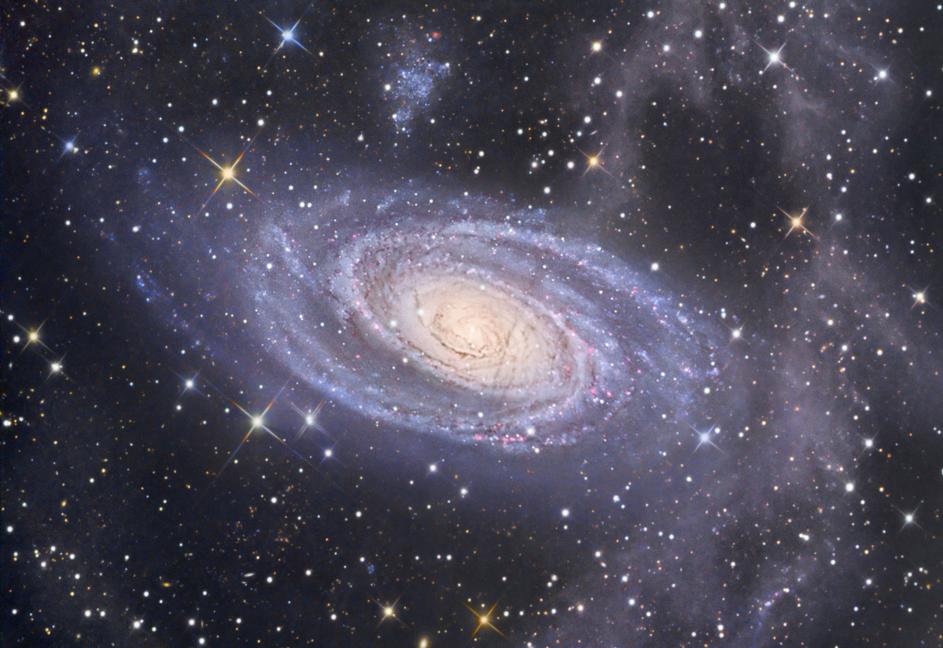 Спиральная галактика М81 в созвездии Большой Медведицы - одна из самых ярких на нашем небе. Она расположена на расстоянии 11,8 млн световых лет от Земли и по размеру сопоставима с Млечным Путем. Над галактикой виден ее спутник - карликовая галактика Холмберг IX