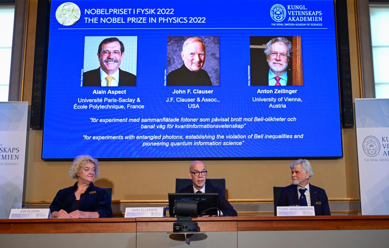 Ален Аспе, Джон Клаузер и Антон Цайлингер (на экране)