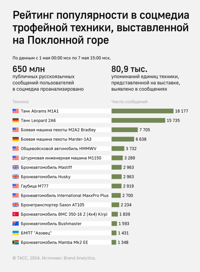Исследователи проанализировали более 650 млн публичных русскоязычных сообщений пользователей в социальных медиа в период с 1 по 7 мая 2024 года. Среди сообщений было выявлено 80,9 тыс. упоминаний единиц техники, представленной на Поклонной горе.