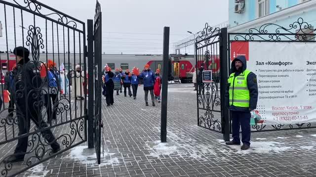 На железнодорожном вокзале гостей встретили большим вятским караваем, испеченным по старинным народным рецептам, вятский Дед Мороз, Васнецовская Снегурочка и волонтеры Новогодней столицы России. Послов гостеприимства приветствовала музыкальная группа - гармонисты братья Мохины и солистка Кристина Калабина. Для представителей российских регионов они исполнили народные песни и новогодние композиции.