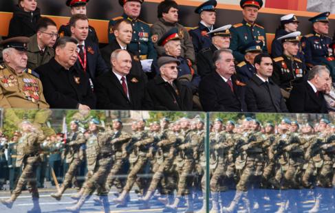 На этой же трибуне - ветераны Великой Отечественной войны. По одну руку от российского лидера - председатель КНР Си Цзиньпин. По другую - участник Великой Отечественной войны.