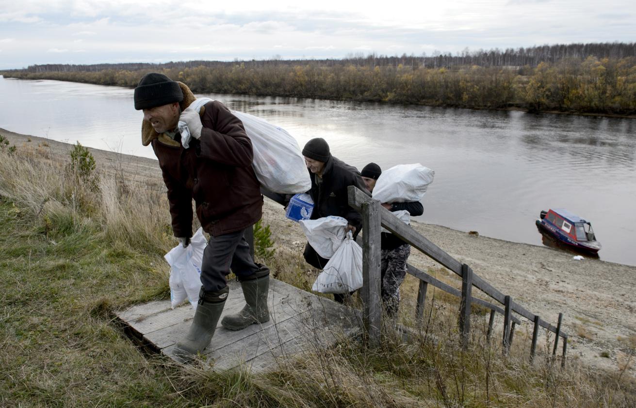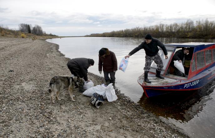 Жители отдаленного поселка во время разгрузки катера Почты России
