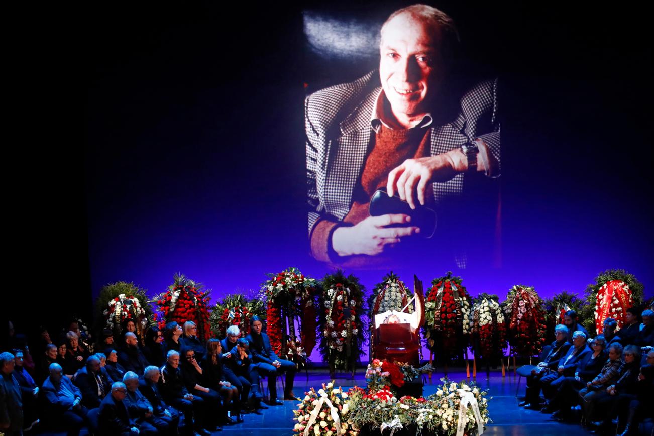 Прощание длилось несколько часов. Гроб был установлен на сцене, рядом находились члены семьи и близкие друзья, почти все свободное пространство занимали венки, люди несли алые и белые розы. На экране был портрет актера.