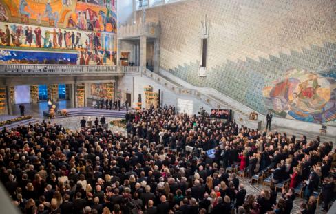 На сцене, украшенной цветочными композициями в красных тонах, председатель Норвежского нобелевского комитета Берит Райсс-Андерсен вручила премьеру Эфиопии золотую медаль с портретом основателя премии Альфреда Нобеля и диплом.