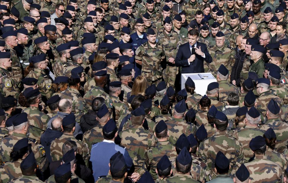 В отличие от многих своих предшественников на посту главы Франции, Макрон никогда не служил в армии. Он родился в декабре 1977 года и принадлежал к последней возрастной группе, подлежащей призыву в армию. Но отсрочку от призыва обеспечивали учеба в университете и необходимость сдачи экзаменов. Вопрос перестал быть актуальным после того, как президент Жак Ширак отменил воинскую обязанность во Франции с 1997 года. Это не мешало Макрону увлекаться фигурой Наполеона. "Наполеон — это часть нас", — говорил Макрон в 200-ю годовщину кончины императора в 2021 году. В глазах Макрона первый император Франции — это, прежде всего, "стратег, умевший защищать национальный суверенитет, строитель и законодатель, который оставил в наследство Франции гражданский кодекс, департаменты, префектов, лицей, Государственный совет и орден Почетного легиона".