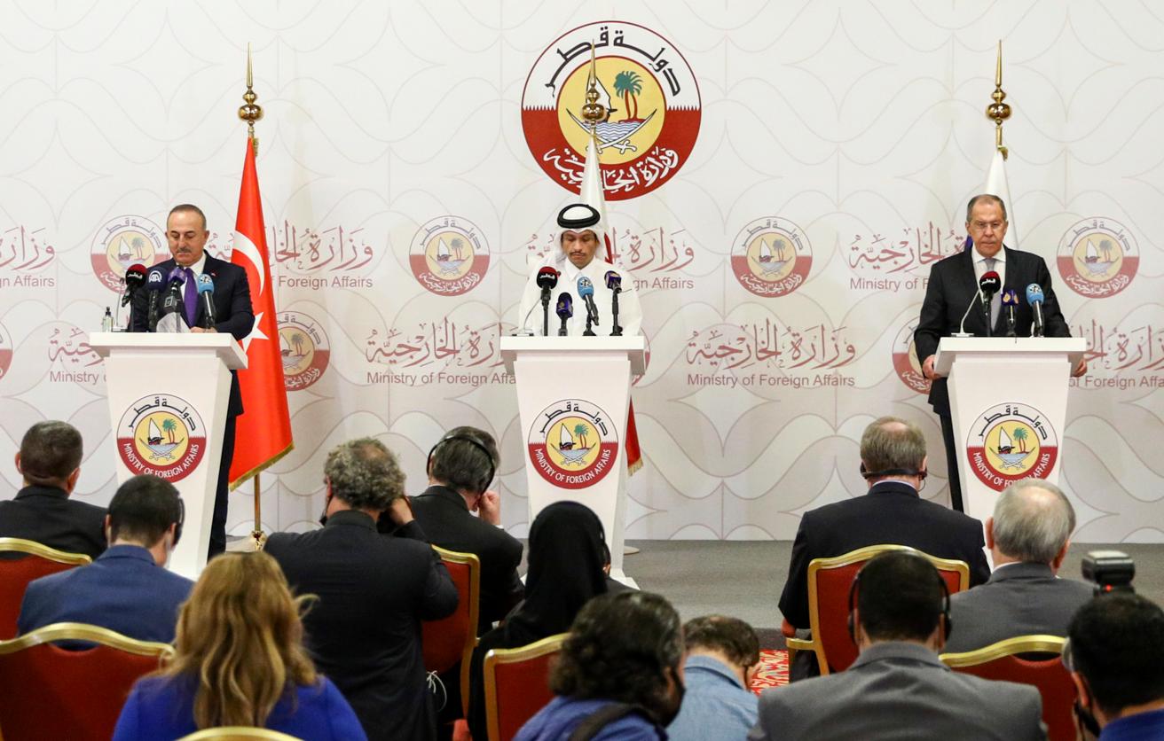 Министр иностранных дел Турции Мевлют Чавушоглу, вице-премьер, министр иностранных дел Катара Мухаммед бен Абдель Рахман Аль Тани и министр иностранных дел РФ Сергей Лавров