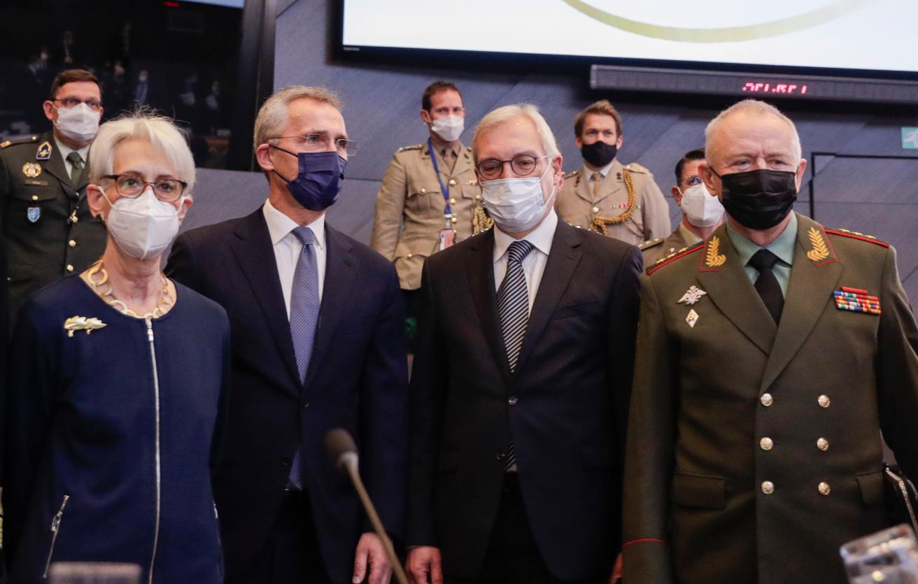 Первый заместитель госсекретаря США Уэнди Шерман, генеральный секретарь НАТО Йенс Столтенберг, глава российской делегации замминистра иностранных дел России Александр Грушко и замминистра обороны России Александр Фомин