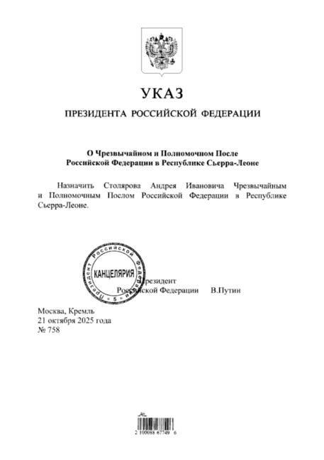"Назначить Столярова Андрея Ивановича чрезвычайным и полномочным послом Российской Федерации в Республике Сьерра-Леоне", - говорится в тексте документа.