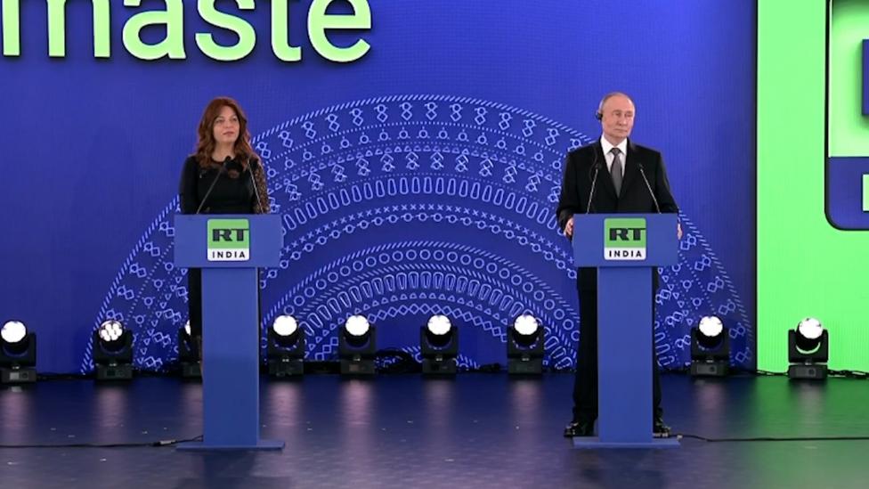 Президент России Владимир Путин принял участие в церемонии запуска нового телеканала RT India. Российский лидер посещает Индию с государственным - высшим по дипломатическому статусу и протокольным почестям - визитом.