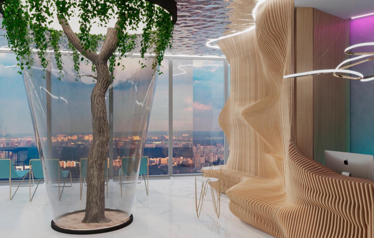 В самом центре ресепшна высокое зеленое дерево - символ природы и всего лучшего, что дала людям планета. Изогнутая параметрическая стена, выполненная из натурального дерева, переходит в каменную лунную поверхность, которая светится изнутри, а потолок ниспадает сверху серебряными потоками воды.