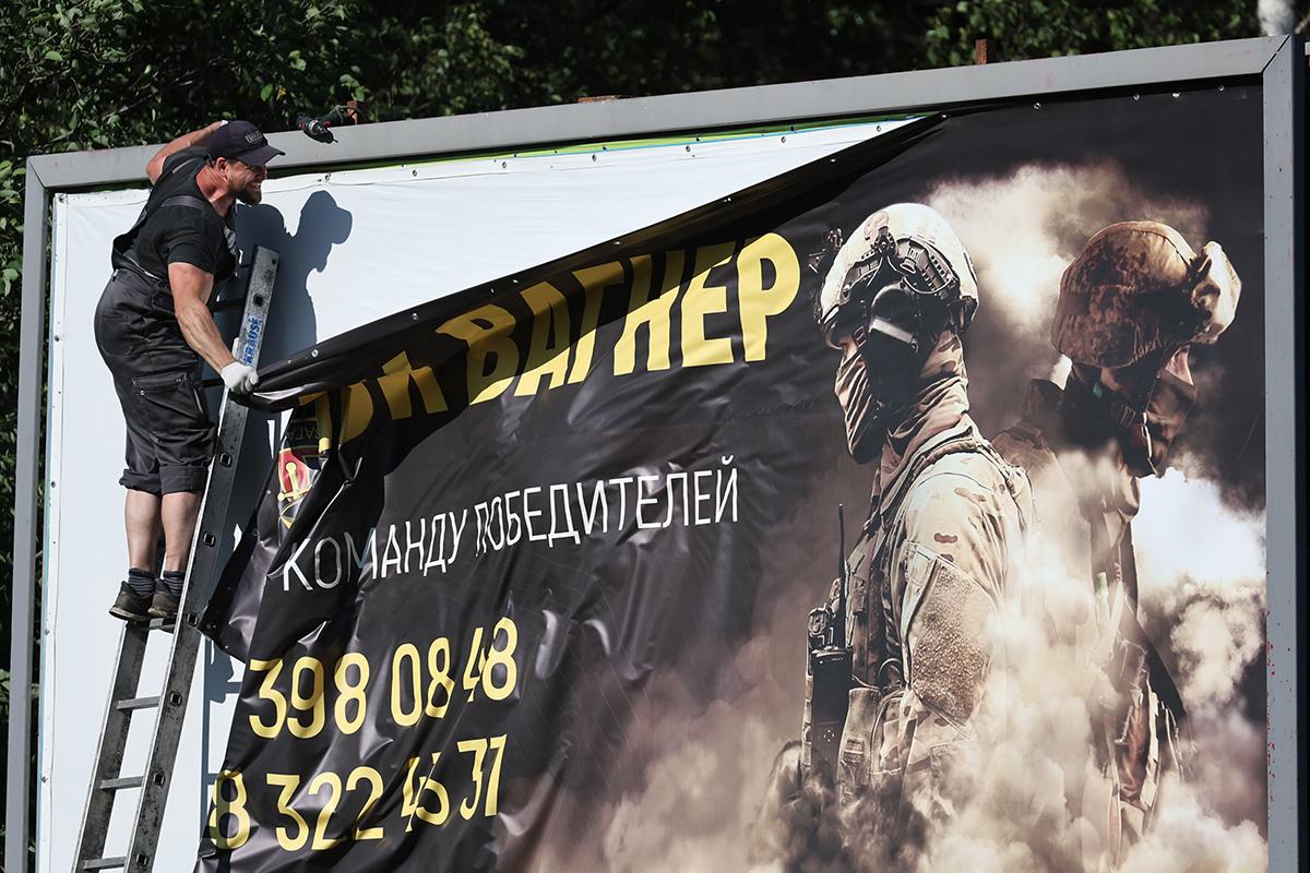 Демонтаж баннера ЧВК "Вагнер" в Санкт-Петербурге