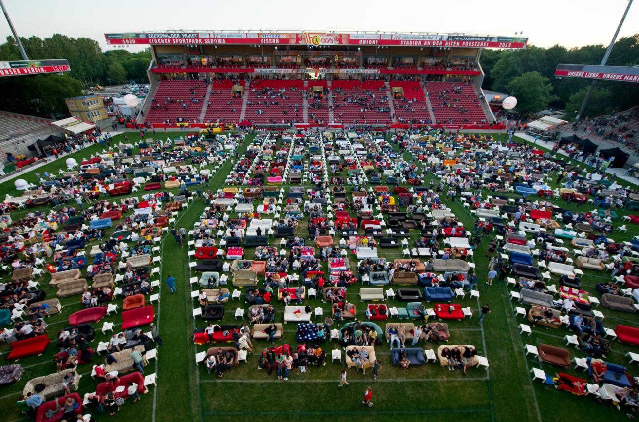 Болельщики в Берлине первый матч открытия на чемпионате мира между сборными Бразилии и Хорватии смотрели на диванах, выставленных на стадионе Alte Foersterei Arena