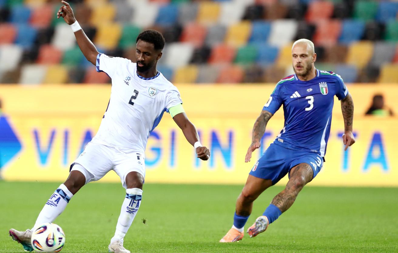 Защитник сборной Израиля Эли Даса и защитник сборной Италии Федерико Димарко